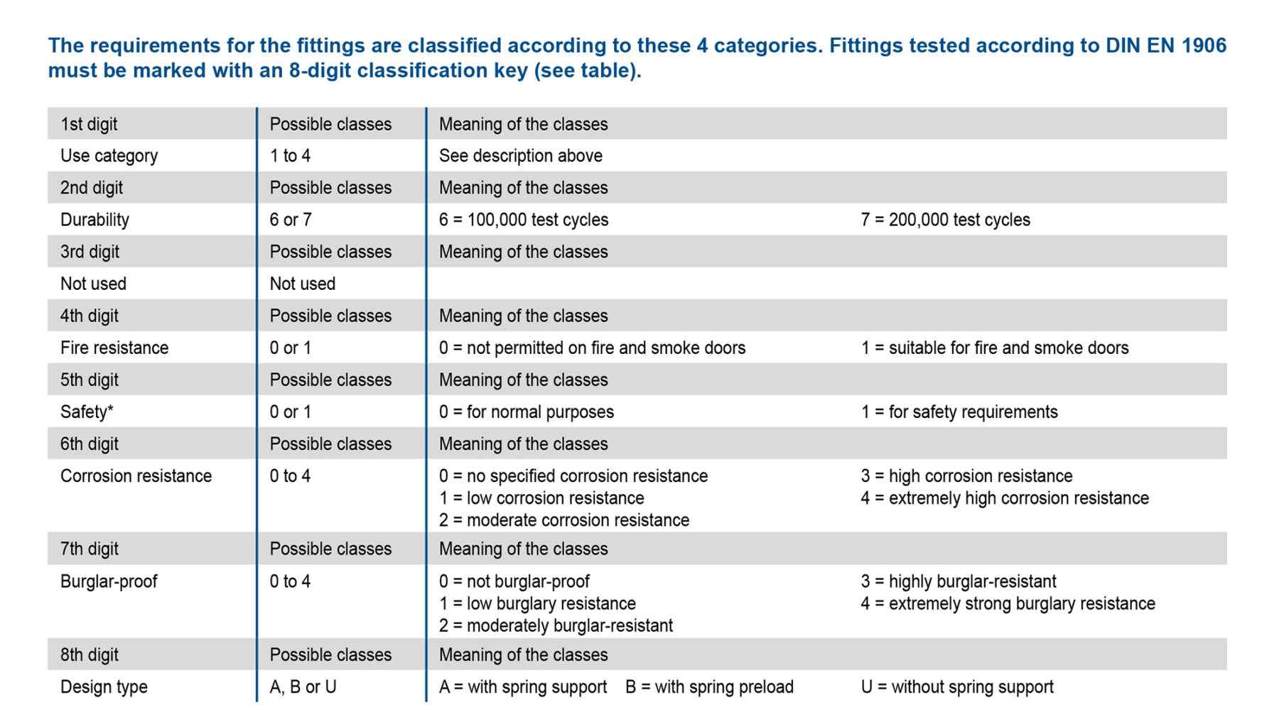 Данный стандарт определяет характеристики производительности. Фурнитура подвергается испытанию на нагрузку, на основании которого присваивается одно из 4 эксплуатационных категорий. Категории основаны на предполагаемой области применения. С этой целью была разработана классификационная система, позволяющая сравнивать фурнитуру. Размеры при этом не учитываются.