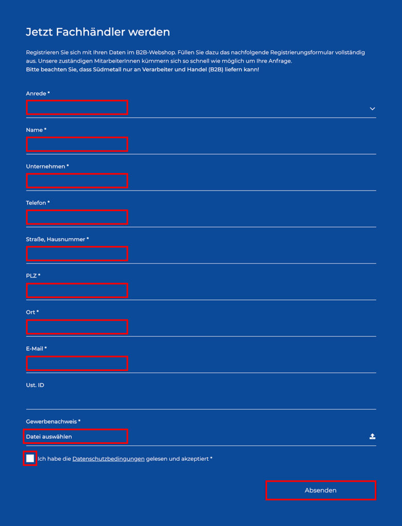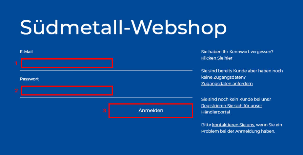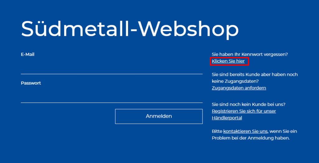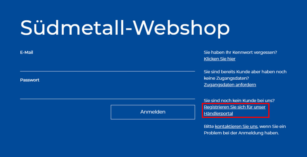 Sie sind noch kein Südmetall-Kunde? Dann klicken Sie auf die entsprechende Zeile im markierten Bereich. Anschließend öffnet sich ein neues Fenster und Sie können sich registrieren.