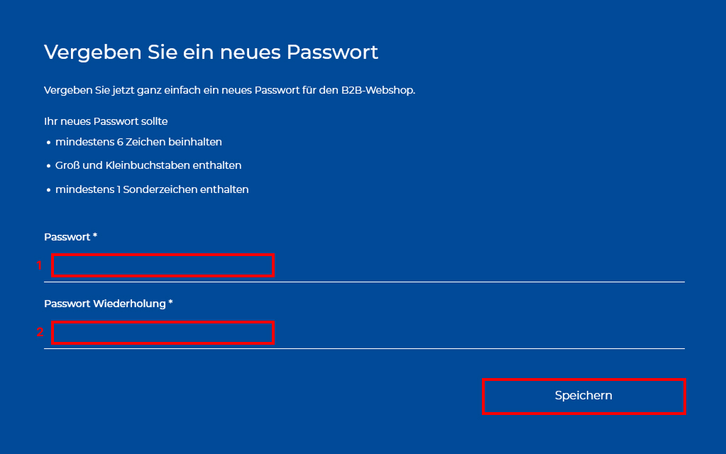 Vergeben Sie jetzt ein neues Passwort. Hierbei muss folgendes enthalten sein: