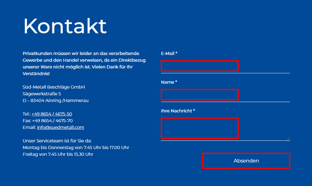 Sie haben eine Frage zu einem Südmetall Produkt oder ein sonstiges Anliegen? Klicken Sie auf die entsprechende Zeile im markierten Bereich. Anschließend öffnet sich ein neues Fenster und Sie können uns direkt eine Kontaktanfrage senden.