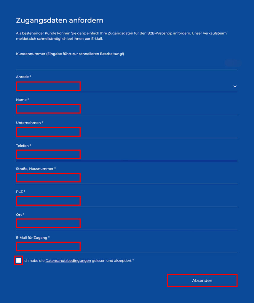 Im neuen Fenster füllen Sie alle mit Sternchen gekennzeichneten Felder des Kontaktformulars aus und Sie erhalten Ihre Zugangsdaten per Mail.
