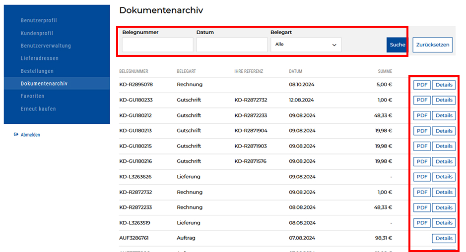Im Feld Dokumentenarchiv finden Sie Ihre Angebote, Aufträge, Rechnungen, Lieferscheine und Gutschriften. Auch hier haben Sie die Möglichkeit nach Belegnummer, Datum und der Belegart zu filtern.