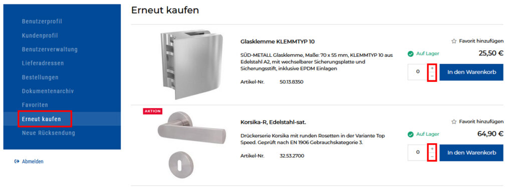 Im Bereich „Erneut kaufen“ werden alle Artikel aufgelistet, die Sie in der Vergangenheit bereits gekauft haben. Wenn Sie den Artikel erneut kaufen möchten, klicken Sie einfach auf „In den Warenkorb“ und der Artikel wird automatisch in den Warenkorb gelegt. Im Feld daneben können Sie auch die Stückzahl anpassen.