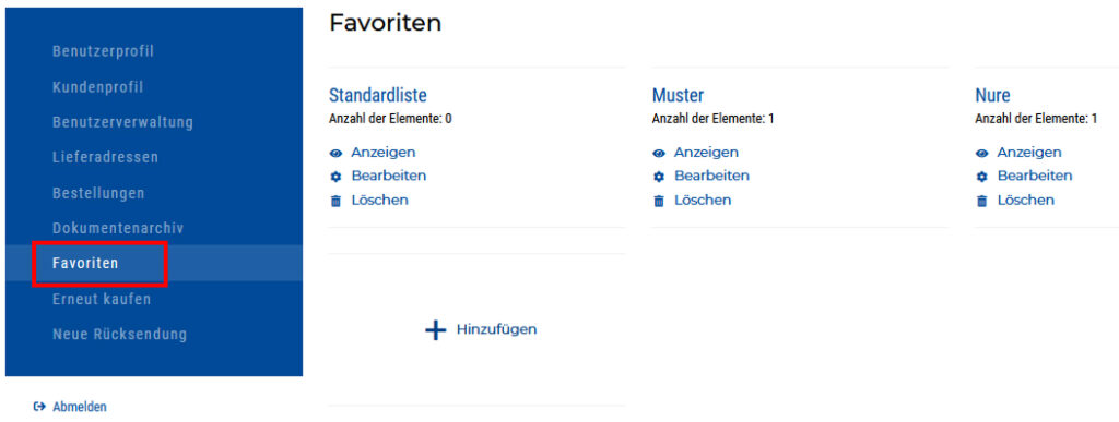 Im Bereich Favoriten können Sie Ihre Lieblingsartikel in Favoritenlisten einsortieren und verwalten.